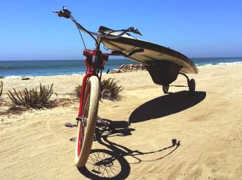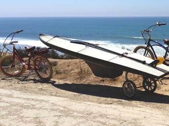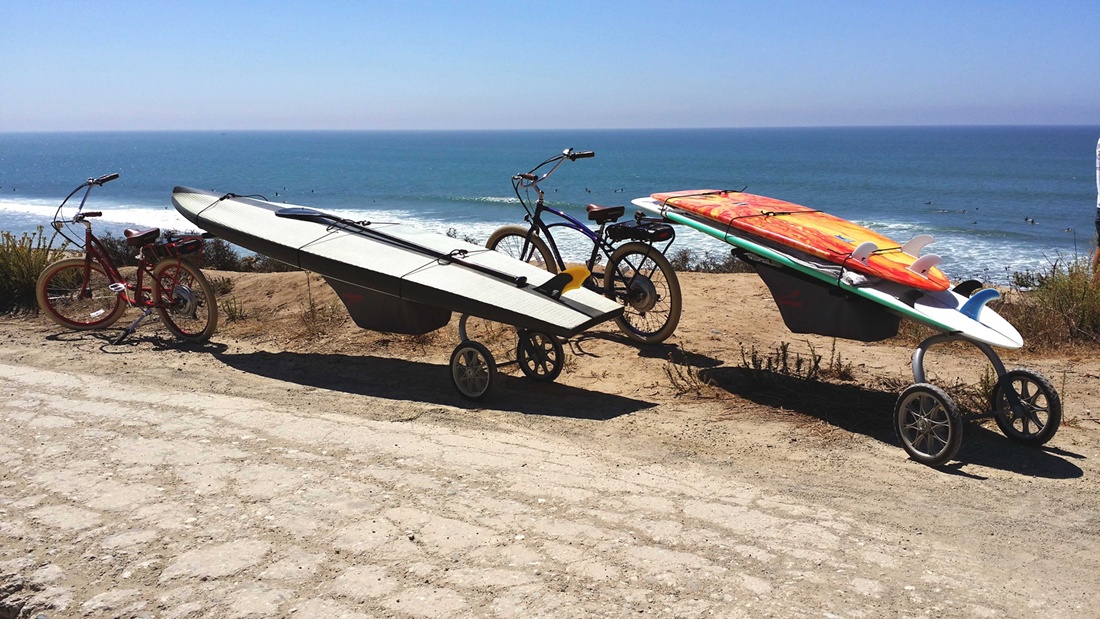 Wheele SUP is a trailer designed to carry Surf and Stand Up Paddle Boards. The trailer easily attaches to a bicycle seat